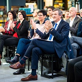 Rund 70 Gäste waren zur Auftaktveranstaltung in Frankfurt gekommen; darunter Vertreterinnen und Vertreter der hessischen Inklusionsbetriebe, der Integrationsfachdienste, der hessischen Arbeitgeberverbände und der IHKs. Martin Berg freute sich über den gelungenen Start der Kampagne und dankte Minister Kai Klose für seine Unterstützung. Weitere Redner waren Thomas Niermann, Leiter LWV Hessen Integrationsamt, und Nicola Bolle, Teamleiterin für berufliche Rehabilitation bei der Agentur für Arbeit.
